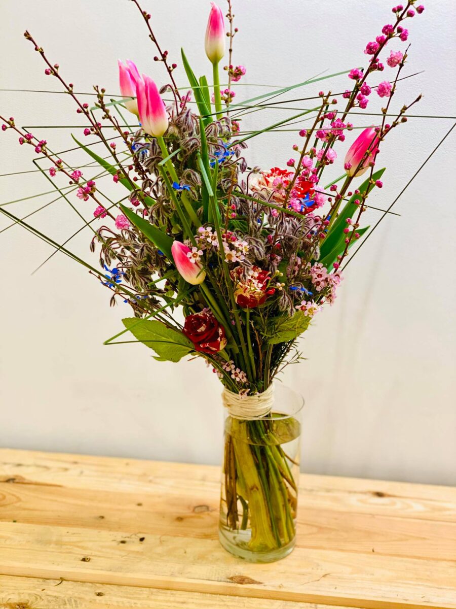 Cézanne – Bouquet di Rose e Tulipani. Esplosione primaverile con Prunus, Wax flower, fiori di Borragine e verde decorativo. Tutte le nostre creazioni floreali sono uniche e originali, ecco perché il colore può variare rispetto a quello in foto. Il tuo bouquet sarà bellissimo vedrai.