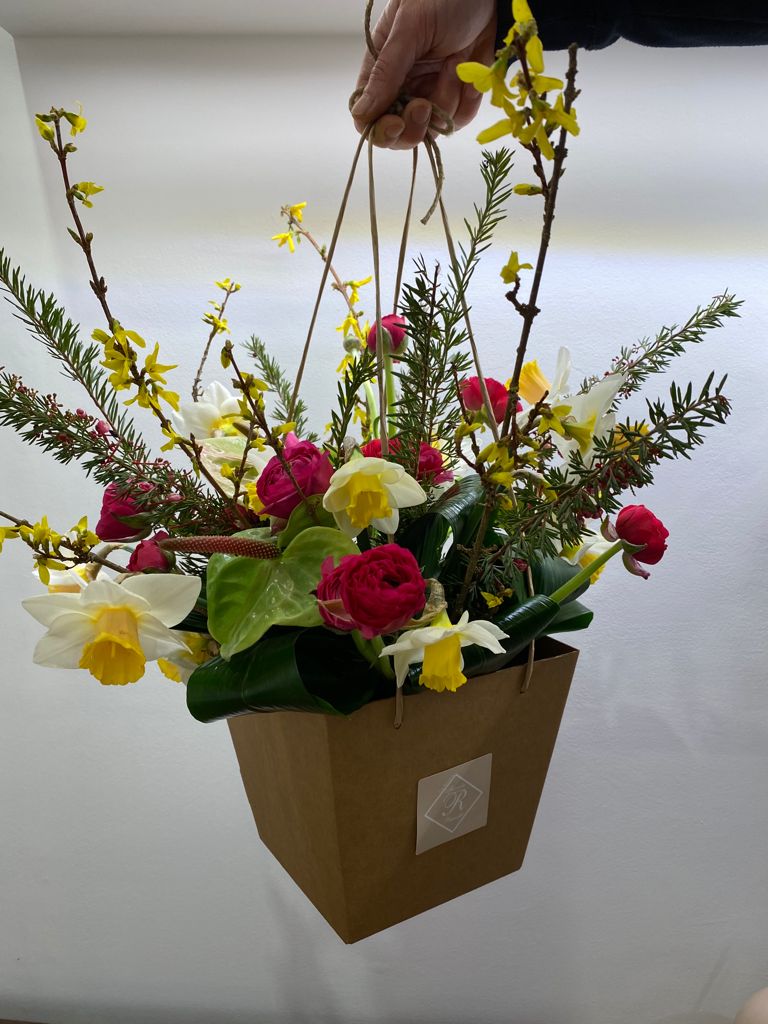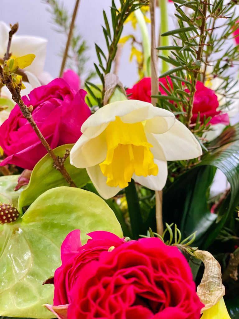 Gauguin – Bouquet in box di Narcisi e Anthurium, con Ranuncoli, rami di Forsizia e verde decorativo. Tutte le nostre creazioni floreali sono uniche e originali, ecco perché il colore può variare rispetto a quello in foto. Il tuo bouquet sarà bellissimo vedrai.