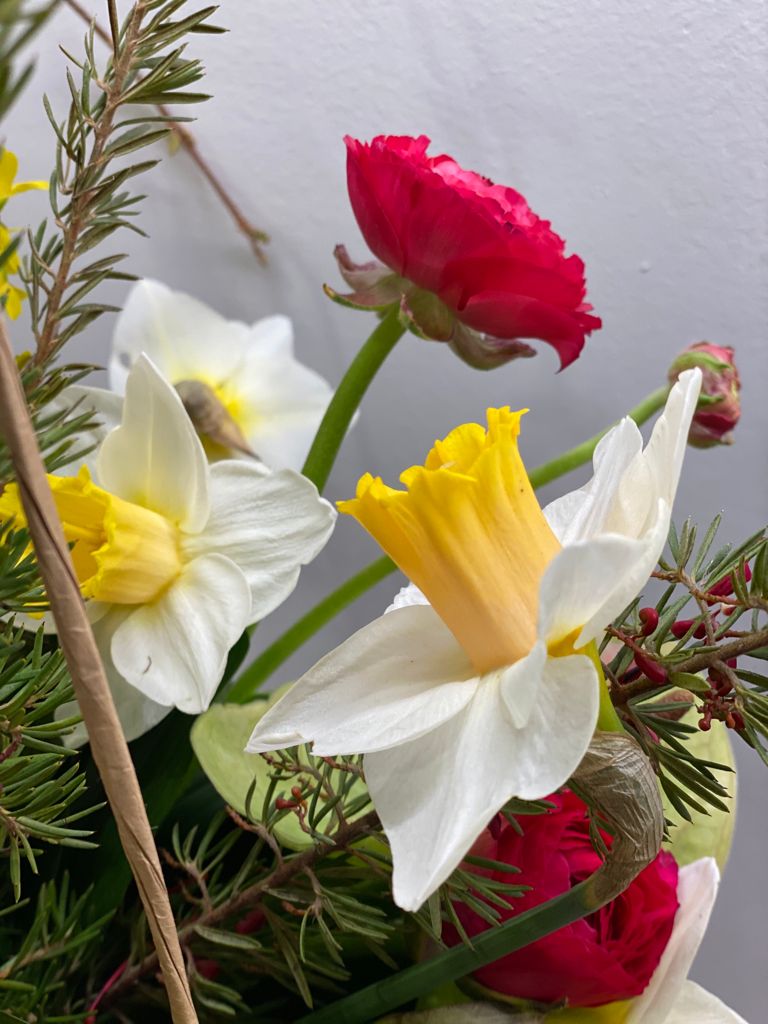 Gauguin – Bouquet in box di Narcisi e Anthurium.