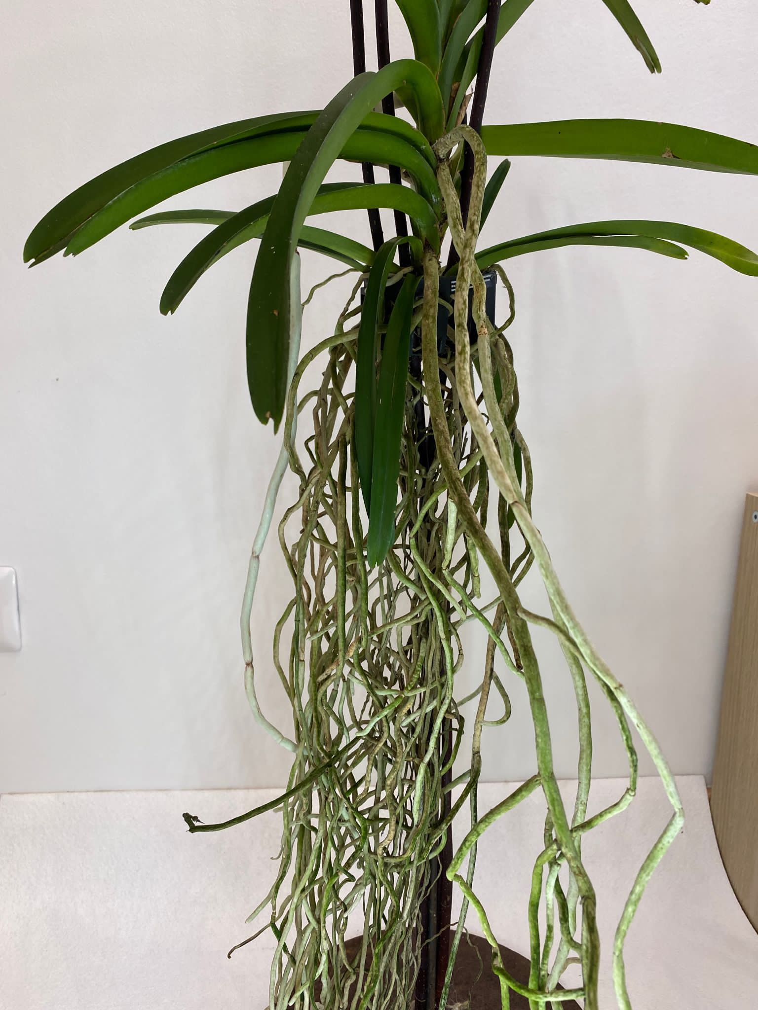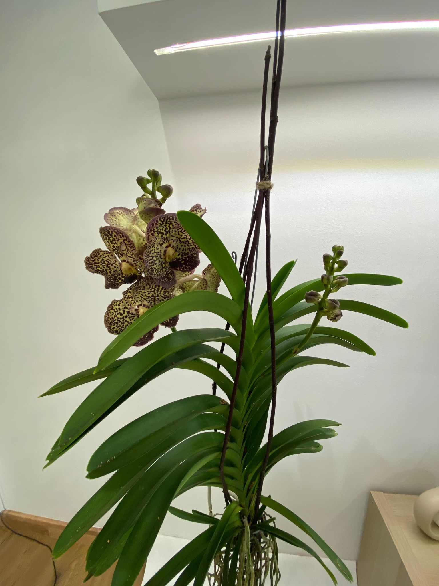 Le orchidee Vanda sono celebri per i loro fiori grandi, luminosi e spesso profumati, che possono variare in una vasta gamma di colori, tra cui blu, viola, rosa, arancione e giallo. I fiori possono avere petali e sepali macchiati o striati, creando effetti visivi spettacolari.Le foglie delle Vanda sono lunghe e strette, di colore verde intenso e lucido, disposte in modo alternato lungo i fusti. Queste foglie sono adattate a trattenere l’umidità, una caratteristica utile per la sopravvivenza nelle foreste tropicali.