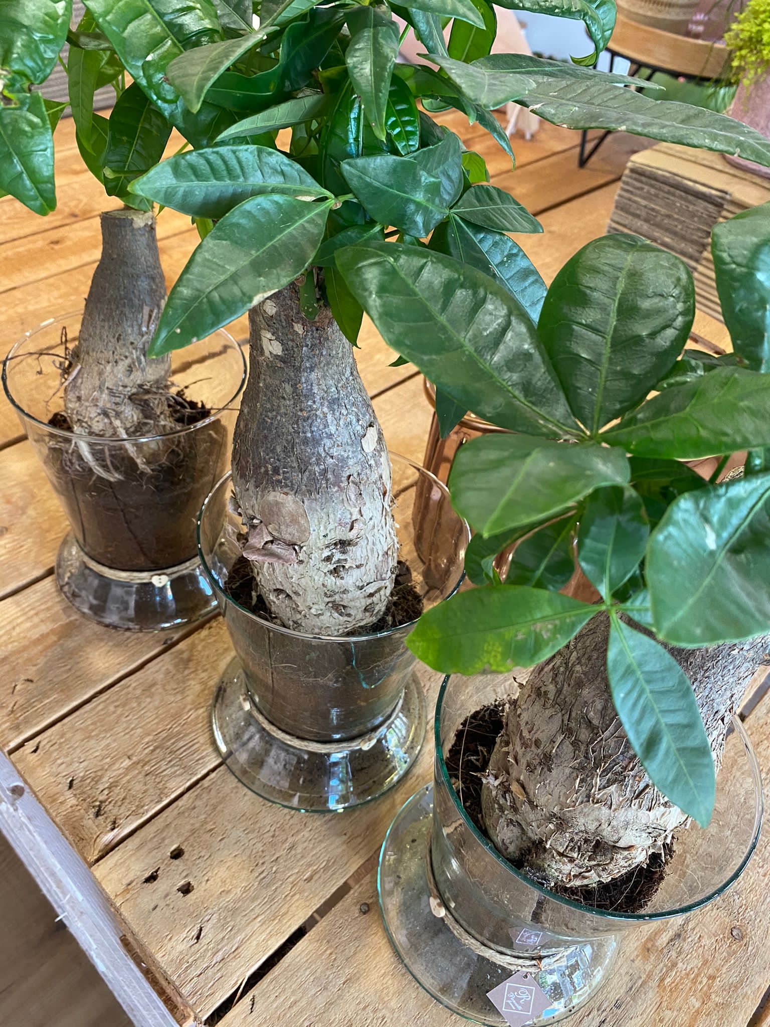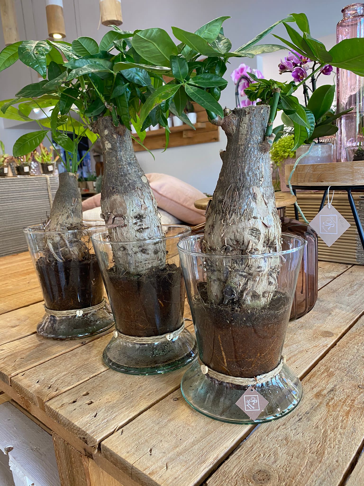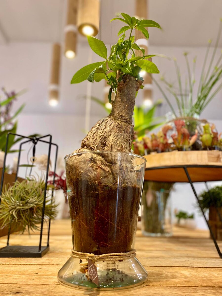 Pianta di Pachira venduta con vaso in vetro e confezionata pronta per essere regalata.